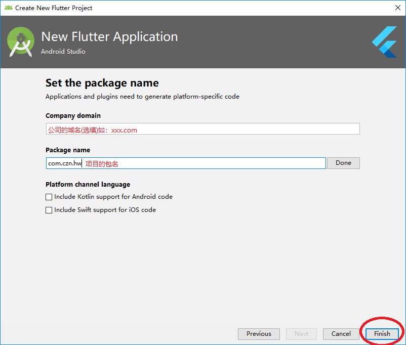 3.在这里只需要填写应用程序的包名,点击完成即可,这个时候只需要等待项目的创建完成了。