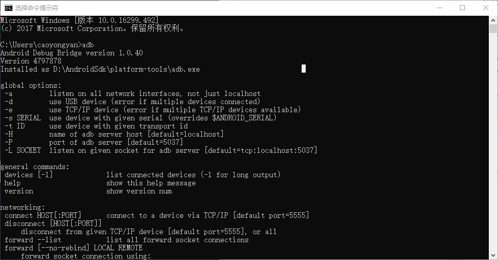 4.检查ADB环境:在命令行窗口输入ADB,检查ADB的环境配置,如果出现如下这些内容,表示ADB的环境没有问题,如有问题在,百度自行解决。