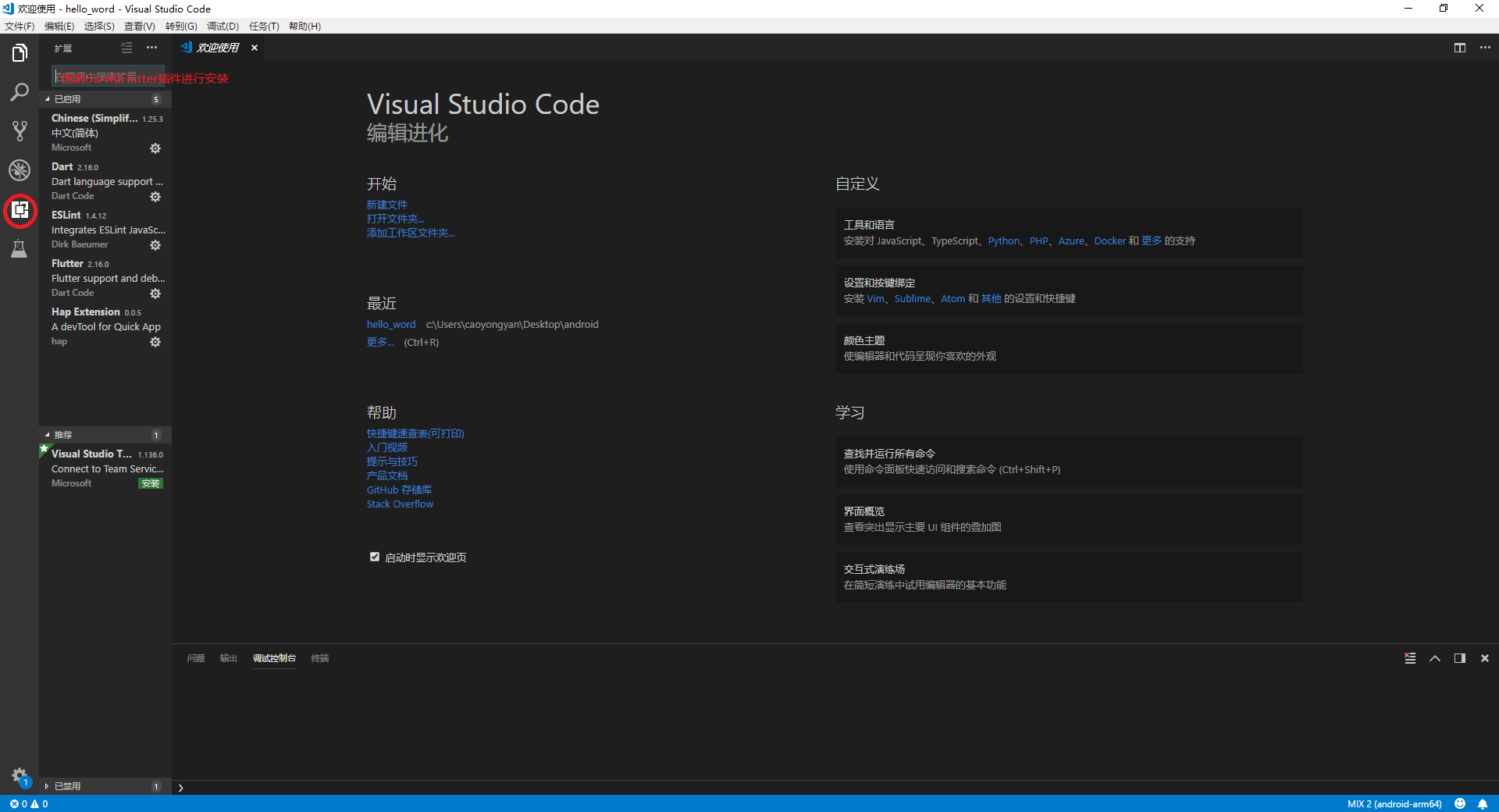 2.创建Flutter项目:点击菜单栏的查看--命令面板搜索Flutter:new Project,在输入项目名回车键完成创建