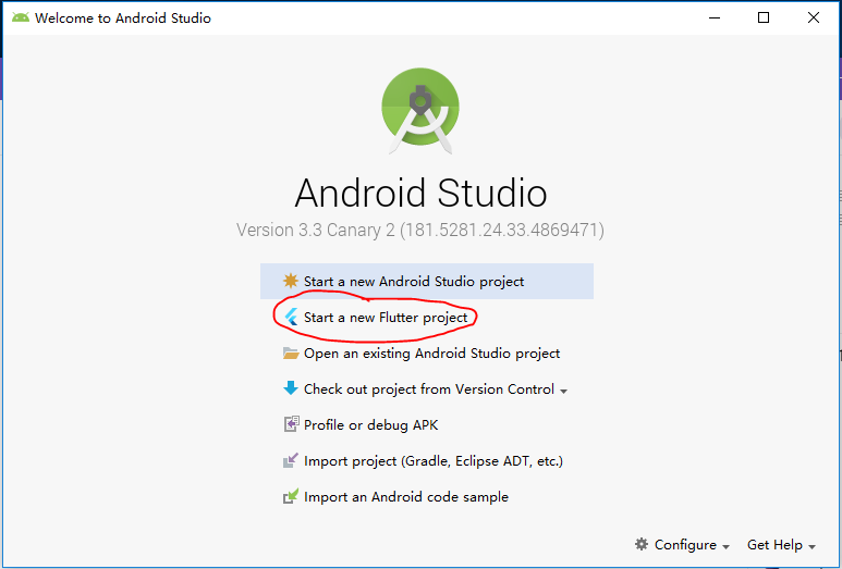 1.安装插件后,欢迎页会出现Start a new Flutter project 的条目,表示成功安装了插件,此时我们可以通过此选项创建一个Flutter的项目,点击Start a new Flutter project进行项目的创建。