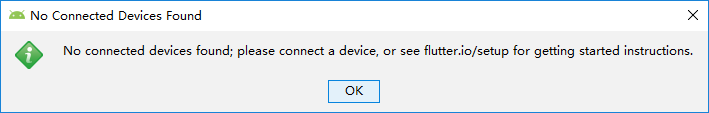 1.项目创建完成后无法连接到调试设备,用ADB查看设备也是连接的,可是工具就是找不到设备,还弹出(No connected devices found; please connect a device, or see flutter.io/setup for getting started instructions.)的对话框,vs code也是连接不上的,开始自己遇到了这种问题,在网上搜索这种问题,大部分说的是,清除AndroidStudio的缓存,或者AndroidStudio的版本过高的问题,但是自己发现,这还是Flutter环境搭建的问题,导致了创建的项目也有问题。(清除缓存说法,也不妨试一试).