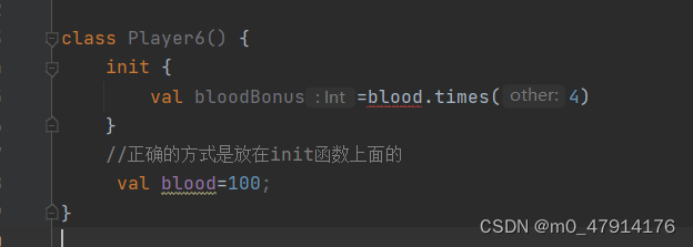 我们在Player类的定义头中定义一个主构造函数,使用临时变量为Player的各个属性提供初始值,而在Kotlin中,为了便于识别,临时变量(包括仅引用一次的参数),通常都会以下划线开头的名字命名。