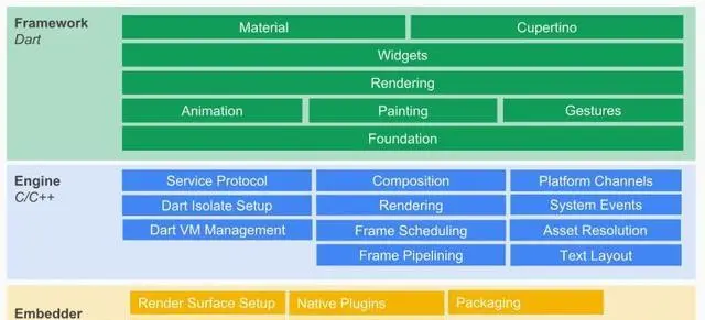 图中的 C / C++ Engine 部分,包含了 skia 和 dart VM。用户撰写的 flutter 代码,连同 flutter framework 一起,最终调用 skia 库通过 GPU 来高效地渲染图像和文字。我们知道,自己在底层控制渲染虽然极其高效,但代码的开发效率很低,所以 flutter 撰写了大量的 SDK 代码来让用户的 flutter 代码简单明了。