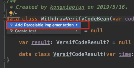 根据官方文档介绍kotlin-android-extensions还有注解自动生成Parcelable的功能,但根据官方文档的步骤,并没有生效,提示我找不到注解@Parcelize。不过我倒是发现了另一个功能一键生成Parcelable代码,非常方便。如下图所示: