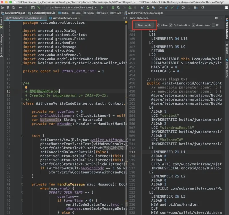 上面说的Kotlin插件已经带了此功能,点击Tools–Kotlin–Show Kotlin ByteCode即可查看到class文件内容,编辑器左上角贴心的带了一个Decompile按钮,点击此按钮即可看到反编译后的Java源码了。如下图所示