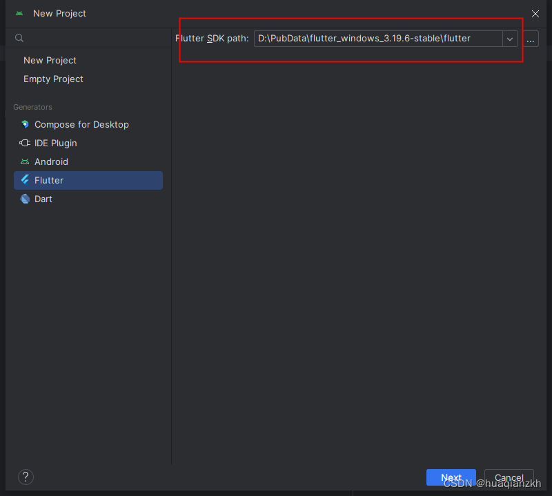 在 Android Studio 打开 File > New > New Flutter Project,选择SDK路径: