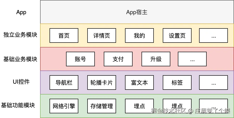 这 4 类组件其实隐含着分层依赖的关系。比如,处于业务模块中的首页,依赖位于基础业务模块中的账号功能;再比如,位于 UI 控件模块中的轮播卡片,依赖位于基础功能模块中的存储管理等功能。将它们按照依赖的先后顺序从上到下进行划分,就是一个完整的 App 了