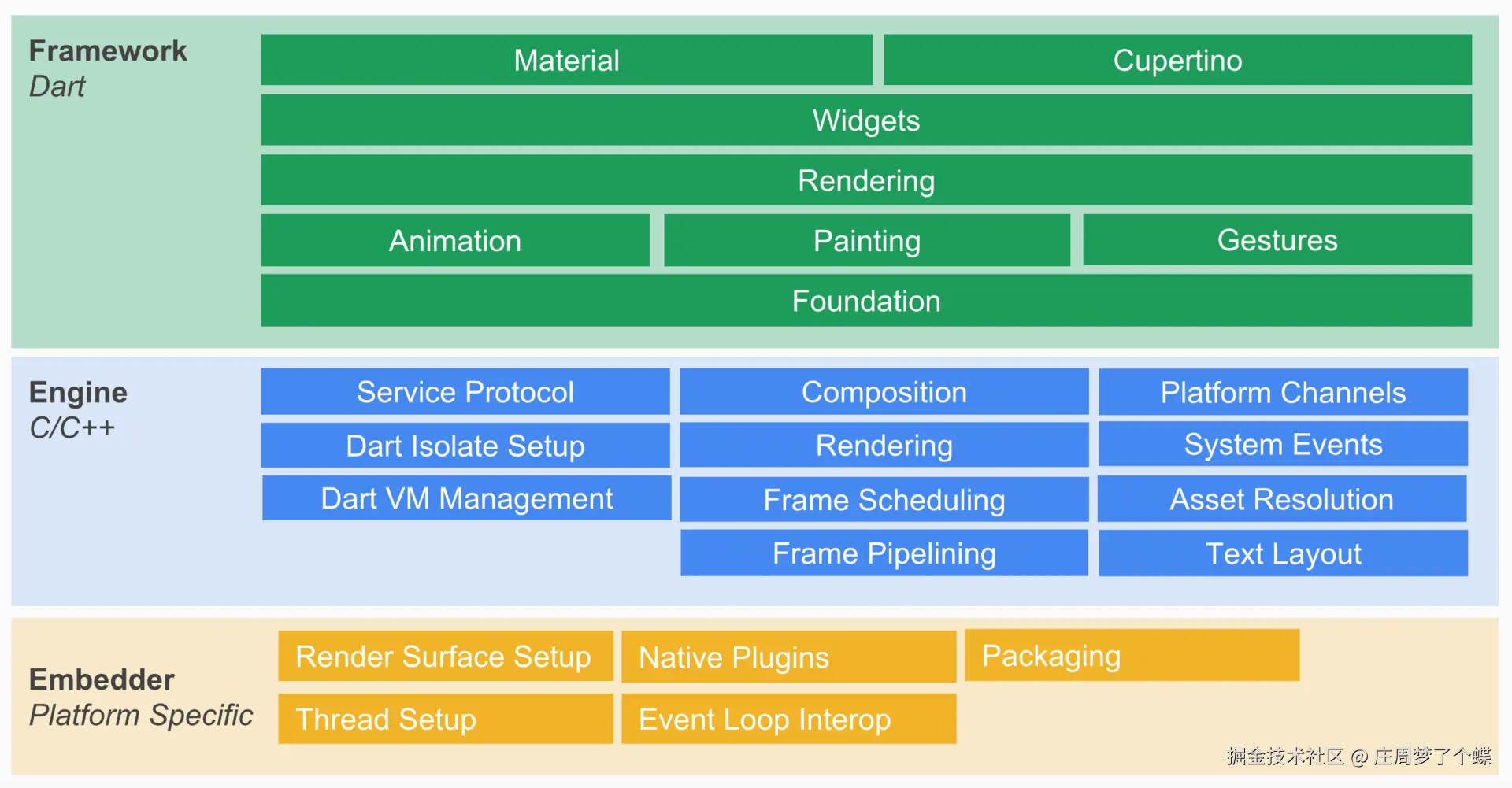 比如,Flutter 就采用 Embedder(操作系统适配层)、Engine(渲染引擎及 Dart VM 层)和 Framework(UI SDK 层)整体三层的划分。可以看到,Flutter 框架每一层的组件定义都有着明确的边界,其向上提供的功能和向下依赖的能力也非常明确。