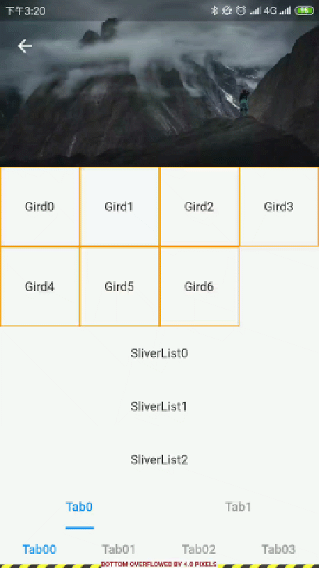 我这里举一个栗子。NestedScrollView的body其实是SliverFillRemaining包住的,它会跟着一起滚动。但是我们这里布局里面是一个Tabbar,它是一个有固定高度的组件,当它超出屏幕的时候就会出现警告。但是事实上,这种警告并不能影响我们的使用。