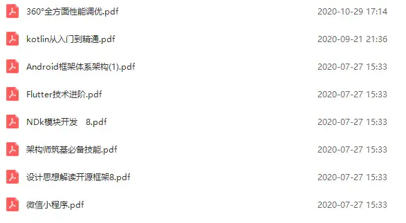 一共十个专题,包括了Android进阶所有学习资料,Android进阶视频,Flutter,java基础,kotlin,NDK模块,计算机网络,数据结构与算法,微信小程序,面试题解析,framework源码!