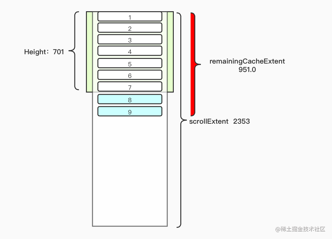 scrollExtent是 2353,也就是整体可滑动距离等于 2353;paintExtent是 701 , 因为ListView的Viewport是 701 ,所以从SliverConstraints得到的remainingPaintExtent是 701,所以默认只需要绘制和布局高度为 701 的部分; (因为默认 paintExtent = layoutExtent )- 对 item 多出的蓝色 8-9 部分,这是因为在