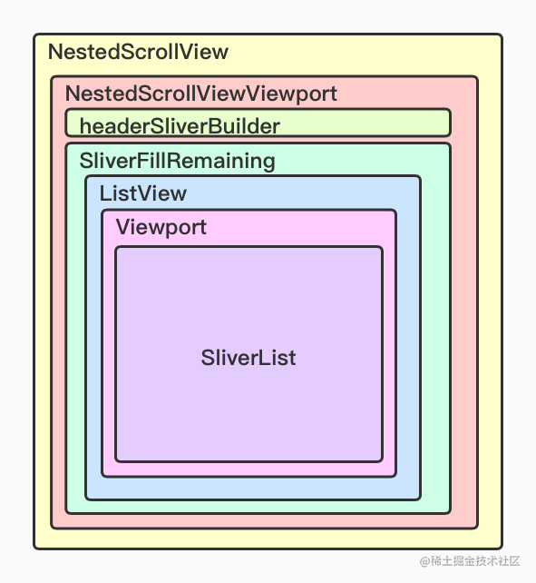 所以 NestedScrollView 的实现本质上其实就是 Viewport 嵌套 Viewport,会有两个 Scrollable 的存在 ,并且嵌套的 ListView 是被放在了 NestedScrollView 的 Sliver 里面,大致如下图所示。