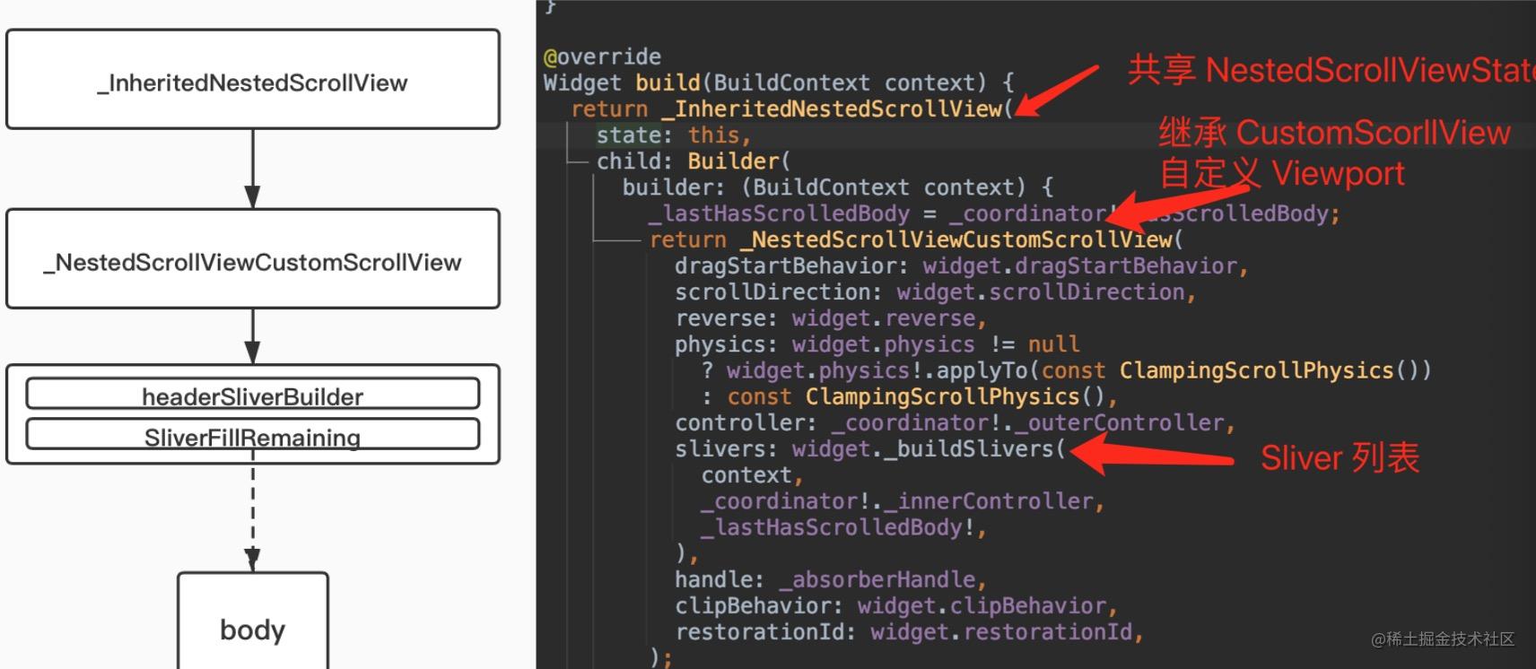 代码里 NestedScrollView 的 body 嵌套的是 ListView , 前面我们介绍了 ListView 本身就是 Viewport + Scrollable + SliverList 组合,而 NestedScrollView 本身也有 NestedScrollViewViewport。