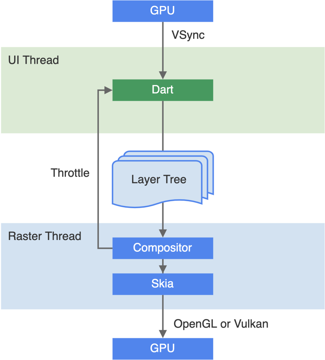 Flutter 框架注册 VSync 回调之后,通过 C++ 侧的 VsyncWaiter 类等待 VSync 信号,后者通过 JNI 等一系列调用,最终 Java 侧的 VsyncWaiter 类调用 Android SDK 的 Choreographer.postFrameCallback 方法,再通过 JNI 一层层传回 Flutter 引擎消费掉此回调。Java 侧的 VsyncWaiter 核心代码如下: