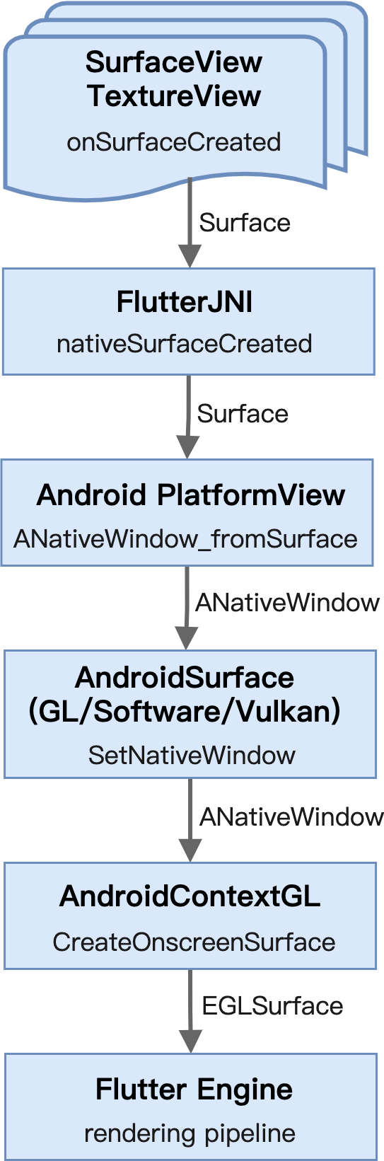 在这一部分,我们需要在鸿蒙系统上构建平台容器,为 Flutter 引擎的图形渲染提供用于上屏的窗口对象。同样,我们参考 Flutter for Android 的实现,看一下 Android 系统是怎么做的: