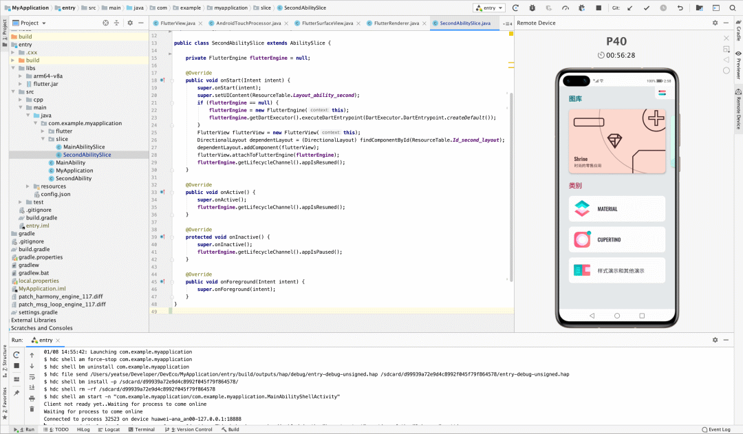 当以上这些能力都准备好之后,我们就可以成功把 Flutter 应用跑起来了。以下是通过 DevEco Studio 运行官方 Flutter Gallery 应用的截图,截图中 Flutter 引擎已经使用鸿蒙系统的平台能力进行了重写: