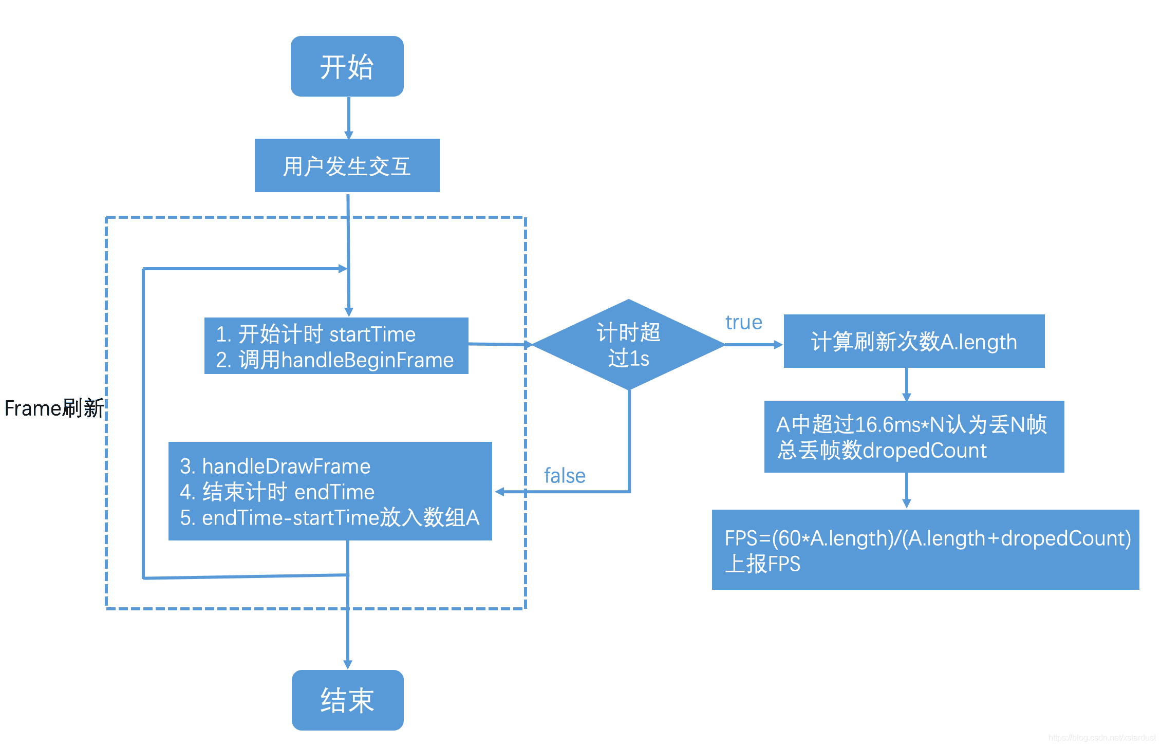 通过计算handleBeginFrame和handleDrawFrame之间的时间间隔计算帧率,主要流程如下图: