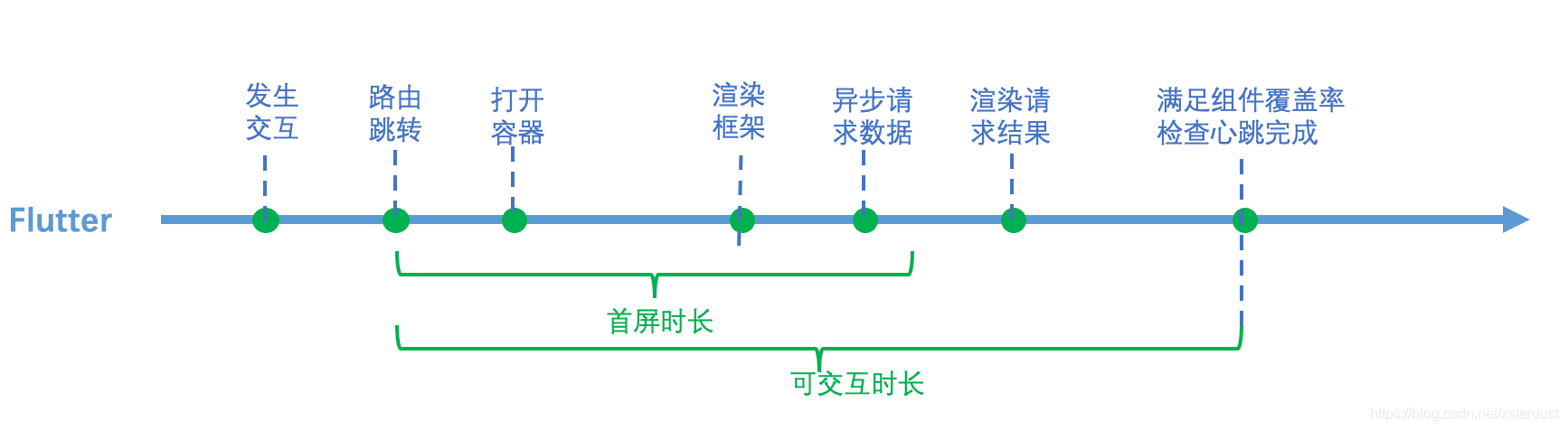 在概念上Flutter和weex的首屏时长和可交互时长并不完全一致,Flutter之所以选择从路由跳转开始计算时长主要是因为这种计算方式更贴近用户体验,可以获取更多的问题信息,比如路由跳转的时长问题等。