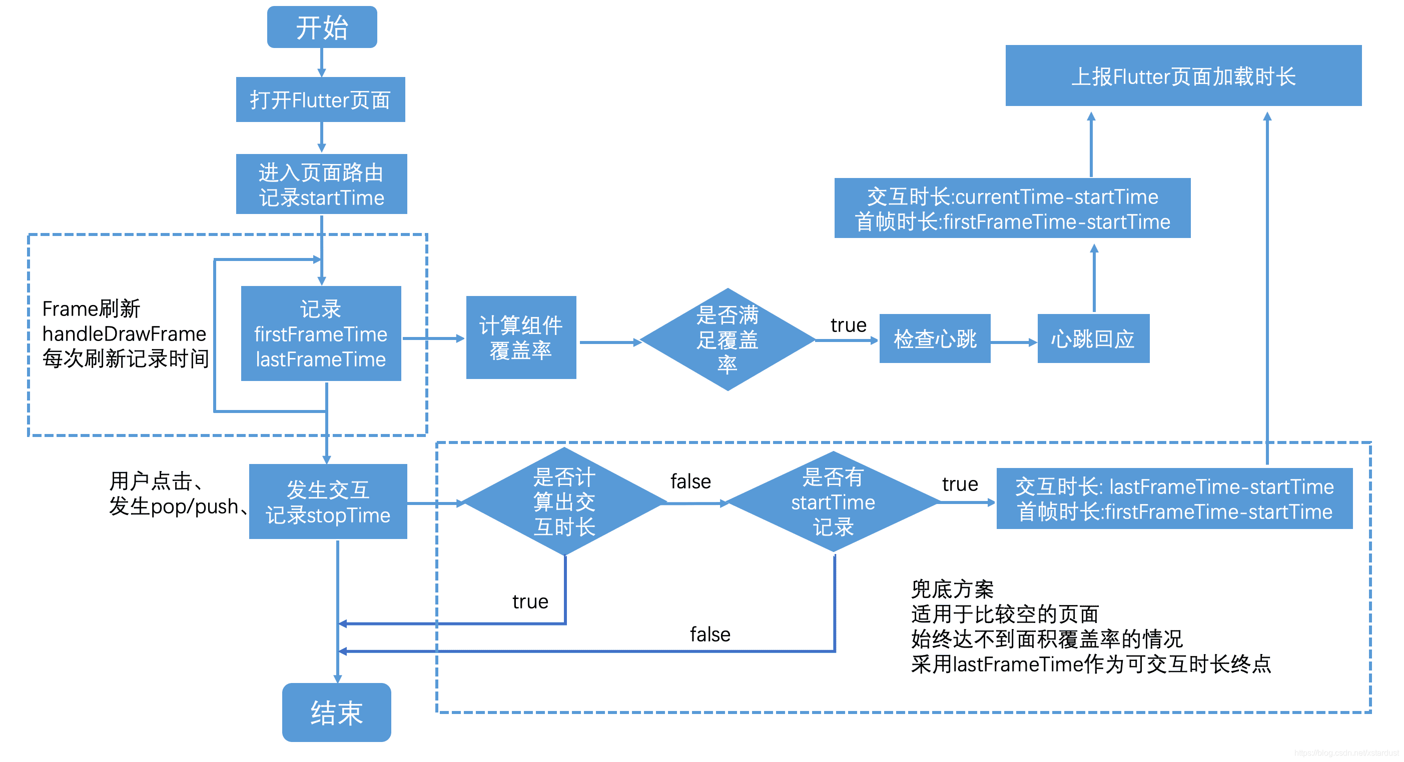 Flutter的可交互时长end点采用的算法与native一致,可见组件满足页面填充程度并且完成心跳检查的情况下任务可交互,另外对于一些比较空的页面,组件面积小,无法达到水平>60%,垂直>80%的条件,就用交互前最后一次Frame刷新时间点作为end点。