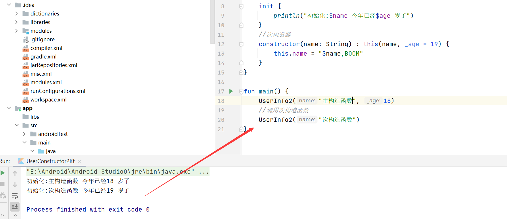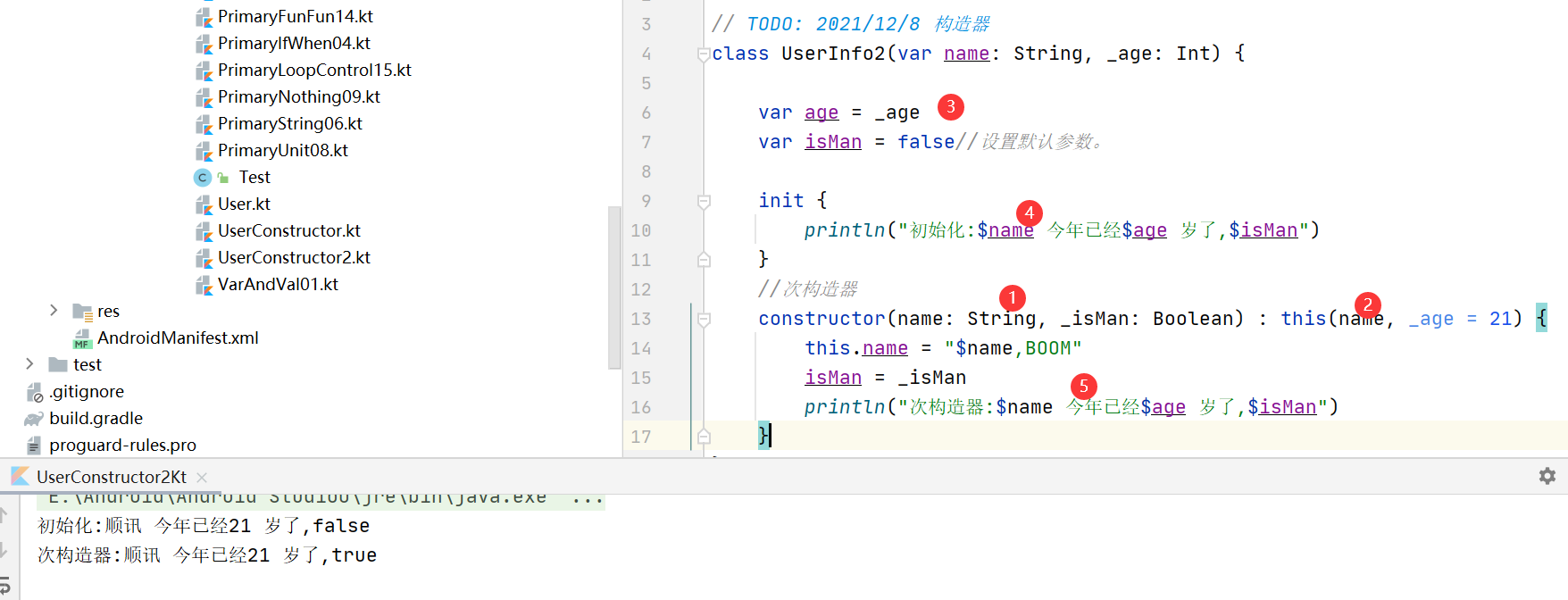 Kotlin允许你不使用临时变量赋值,而是直接用一个定义同时指定参数和类属性,这种方式定义类属性,可以减少重复代码。这里我们对name进行了改造,直接在主构造函数里面定义属性,而不是通过临时变量进行赋值。次构造器我们可以定义多个次构造函数来配置不同的参数组合。同时,可以使用次构造函数,定义初始化代码逻辑。在同一个类中代理另一个构造函数使用this 关键字实践init {name今年已经name 今