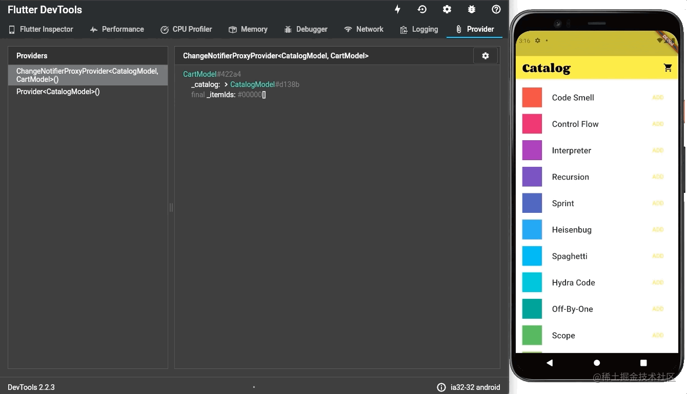 事实上,这个标签是由 Remi Roussel 创建,provider 包维护人员。如果你正在运行最新版本的Flutter DevTools,并且正在调试使用 provider 插件的 Flutter 应用程序,则将自动获得新的“Provider” 选项卡。