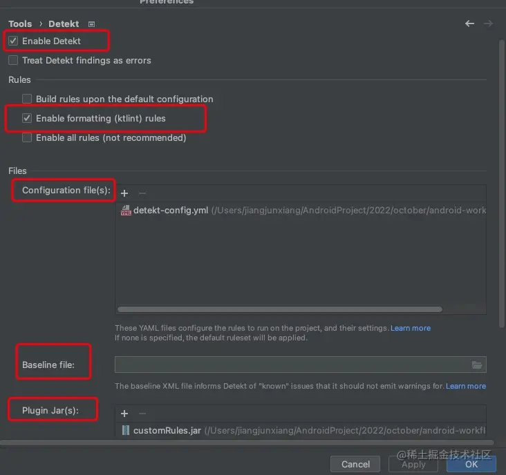 DeteKt直接使用了ktlint的规则 Configuration file:规则配置文件,可以在其中配置各种规则的开关与参数,默认配置可见:default-detekt-config.ymlBaseline file:基线文件,跳过旧代码问题,有了这个基线文件,下次扫描时,就会绕过文件中列出的基线问题,而只提示新增问题。Plugin jar: 自定义规则jar包,在自定义规则后打出jar包,在扫描时就可以使用自定义规则了