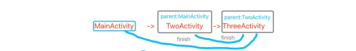 <activity android:name=".TwoActivity" android:parentActivityName=".MainActivity"> <!-- The meta-data tag is required if you support API level 15 and lower --> <meta-data android:name="android.support.PARENT_ACTIVITY" android:value=".MainActivity" /> </activity> <activity android:name=".ThreeActivity" android:parentActivityName=".MainActivity"> <!-- The meta-data tag is required if you support API level 15 and lower --> <meta-data android:name="android.support.PARENT_ACTIVITY" android:value=".MainActivity" /> </activity>