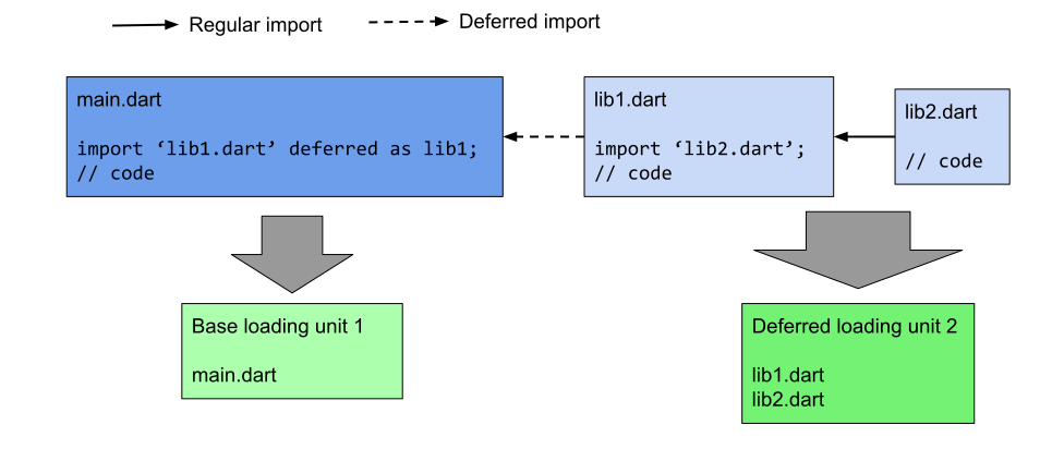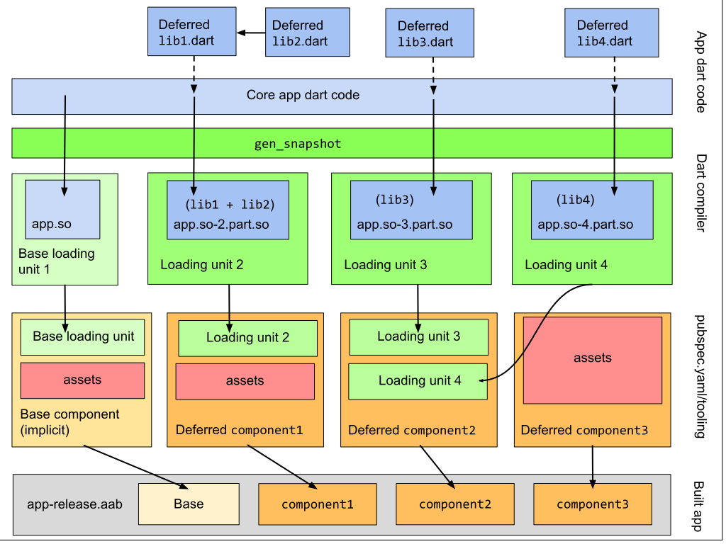 延期的 Dart 库通过 gen_snapshot(Dart编译器)生成「加载单元」,当以 profile 或者 release 模式构建的时候,每个加载单元输出为一个拆分的 AOT 共享库(.so 文件)。加载单元是代码中用 deferred 关键字引入库的最小的集合,可以从基础库中分离出来。
