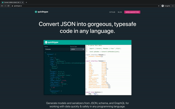所以,我的首选工具一直是quicktype.io。一群开源开发者维护的在线工具。