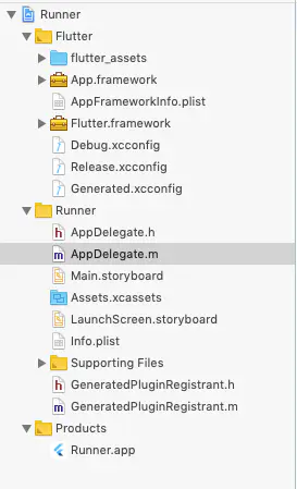 1.我们首先运行一下看看项目有没有问题。首先打开iOS模拟器,终端进入flutter_app目录下,我们执行"flutter run"命令运行项目,可以看到一个计数器的项目启动起来了。我们直接打开flutter_app目录下的ios文件夹里面是一个xcode项目,直接打开Runner.xcworkspace项目结构如下:
