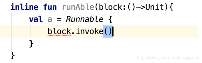 上面代码使用了咱们非常熟悉的 Runnable ,但是发现报错了,为什么呢?上面已经说出了答案,这就是 crossinline 关键字的作用,可以让无法使用内联函数的函数来使用内联函数: