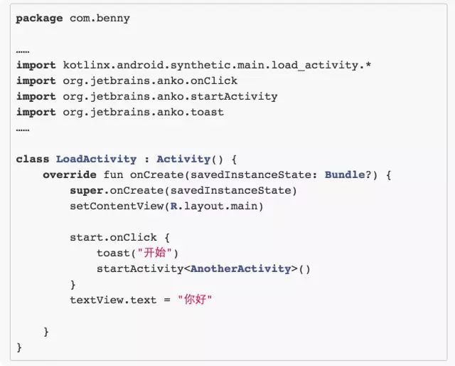 于是你就发现你再也不用 findViewById 了,多么愉快的一件事!!!当然,你还会发现 Toast 的调用也变得简单了,那其实就是一个扩展方法 toast();而 startActivity 呢,其实就是一个 inline加reified 的应用——这我们前面都提到过了。