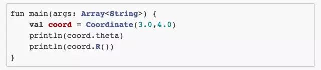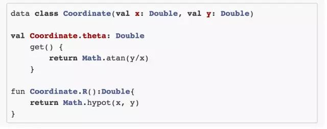 我们已经介绍过 data class,Coordinate 有两个成员分别是 x 和 y,我们知道通常表示一个二维平面,有这俩够了;然而我们在图形学当中经常会需要求得其极坐标,所以我们扩展了 Coordinate,增加了一个属性 theta 表示角度(反正切的值域为 -π/2 ~ π/2,所以这个式子不适用于二三象限,不过这不是重点了),增加了一个 R 方法来获得点的半径,于是我们在 main 方法中就可以这么用: