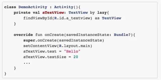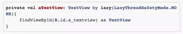 lazy 是 Kotlin 的属性代理的一个实例,它提供了延迟加载的机制。换句话说,这里的 lazy 提供了初始化 aTextView 的方法,不过真正初始化这个动作发生的时机却是在 aTextView 第一次被使用时了。lazy 默认是线程安全的,你当然也可以关掉这个配置,只需要加个参数即可: