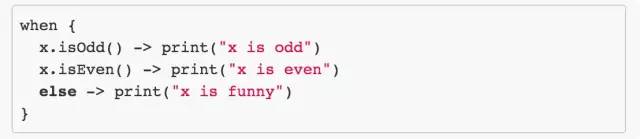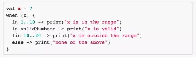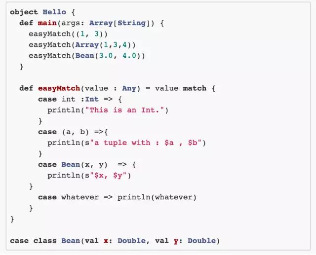 只要是返回 Boolean 的表达式就可以作为 when 的子式,这样 when 表达式的灵活性可见一斑。当然,与 Scala 相比,Kotlin 还是要保守一些的,下面给出一个 Scala 类似的例子,大家感受一下,这实际上也可以体现出 Kotlin 在增加 Java 的同时也尽量保持简单的设计哲学(大家都知道,毕竟 Scala 需要智商o(╯□╰)o)。