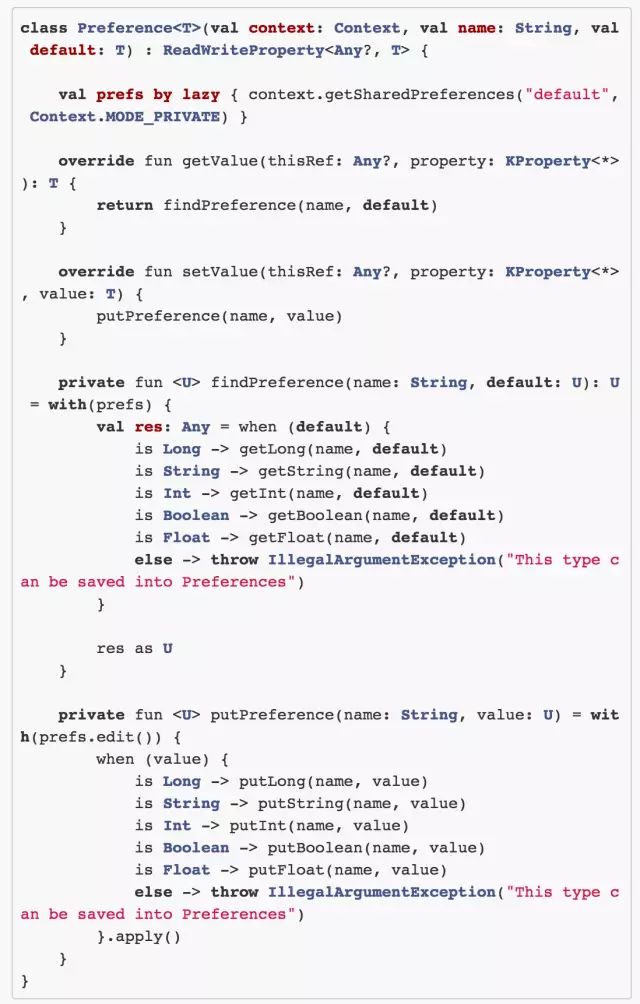 需要说明的是,这段代码是我从《Kotlin for Android Developer》的示例中摘出来的。有了这个 Delegate 类,我们就可以完全不需要关心 SharedPreference了,下面给出使用的示例代码:
