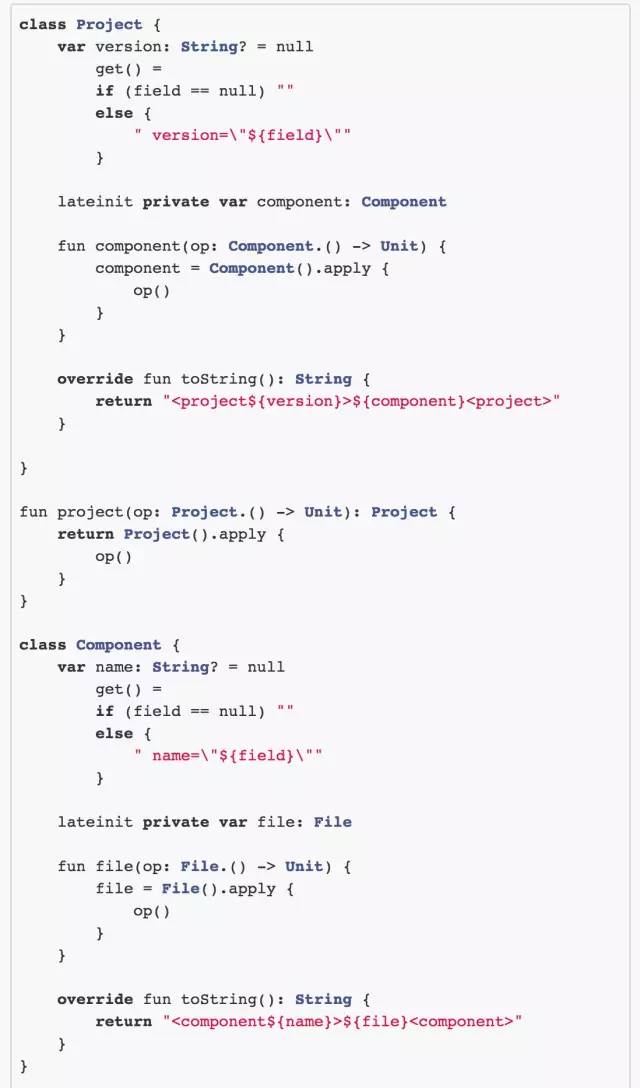 我们看到在 main 方法当中,我们用 Kotlin 定义的 dsl 写出了一个 Project 对象,它有这与 xml 描述的一致的结构和含义,如果你愿意,可以构造相应的方法来输出这样的 xml,运行之后的结果: