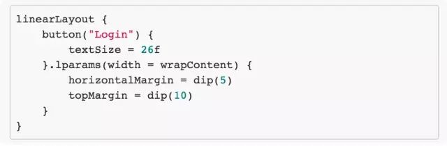 下面我们再来提一个有意思的东西,我们从做 Android 开发一开始就要编写 xml,印象中这个对于我来说真的是一件痛苦的事情,因为它的工作机制并不如代码那样直接(以至于我现在很多时候居然喜欢用 Java 代码直接写布局)——当然,最主要的问题并不是这个,而是解析 xml 需要耗费 CPU。Kotlin 有办法可以解决这个问题,那就是 DSL 了。下面给出一个例子: