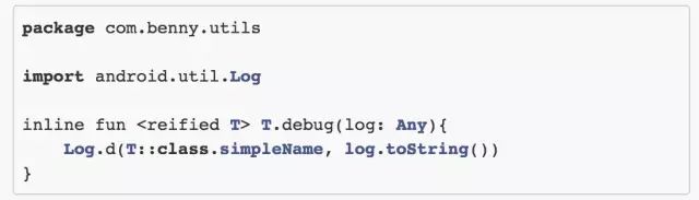 嗯,这里需要简单介绍 Kotlin 在泛型中的一个比较重要的增强,这个在 Java 中无论如何也是做不到的:inline、reified。我们再来回头看一下 debug 这个方法,我们发现它可以通过泛型参数 T 来获取到T的具体类型,并且拿到它的类名——当然,如果你愿意,你甚至可以调用它的构造方法来构造一个对象出来——为什么 Kotlin 可以做到呢?因为这段代码是 inline 的,最终编译时是要编译到调用它的代码块中,这时候T的类型实际上是确定的,因而 Kotlin 通过 reified 这个关键字告诉编译器,T 这个参数可不只是个摆设,我要把它当实际类型来用呢。