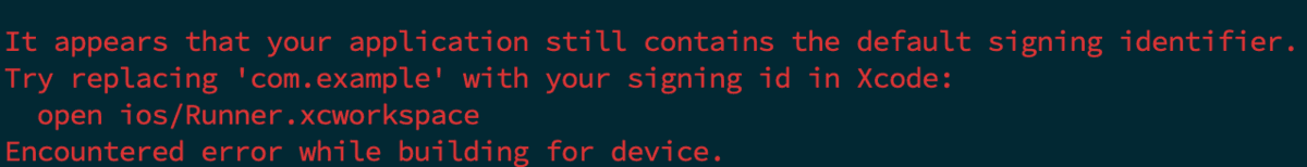 It appears that your application still contains the default signing identifier.Try replacing 'com.example' with your signing id in Xcode:
