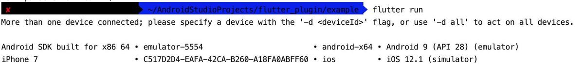 提示你当前有两个模拟器设备,跑设备的时候要选择运行在哪个设备上,flutter run后面拼接上“-d <deviceId>”,deviceId 是第二列的内容。