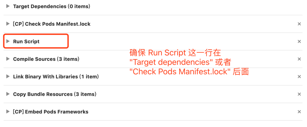 最后,确保 Run Script 这一行在 "Target dependencies" 或者 "Check Pods Manifest.lock" 后面。