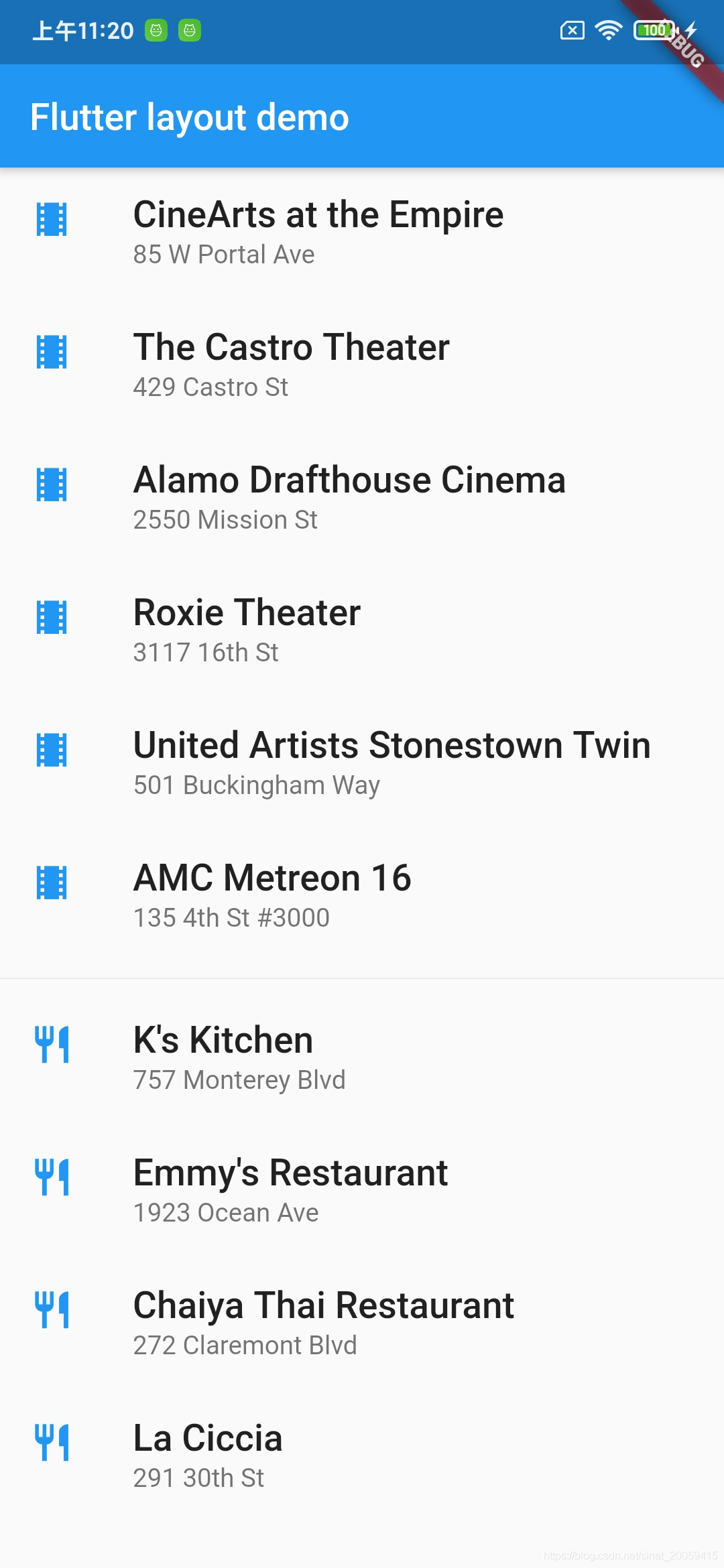 使用 ListView 的业务列表,它使用了多个 ListTile。Divider 将餐厅从剧院中分隔开。