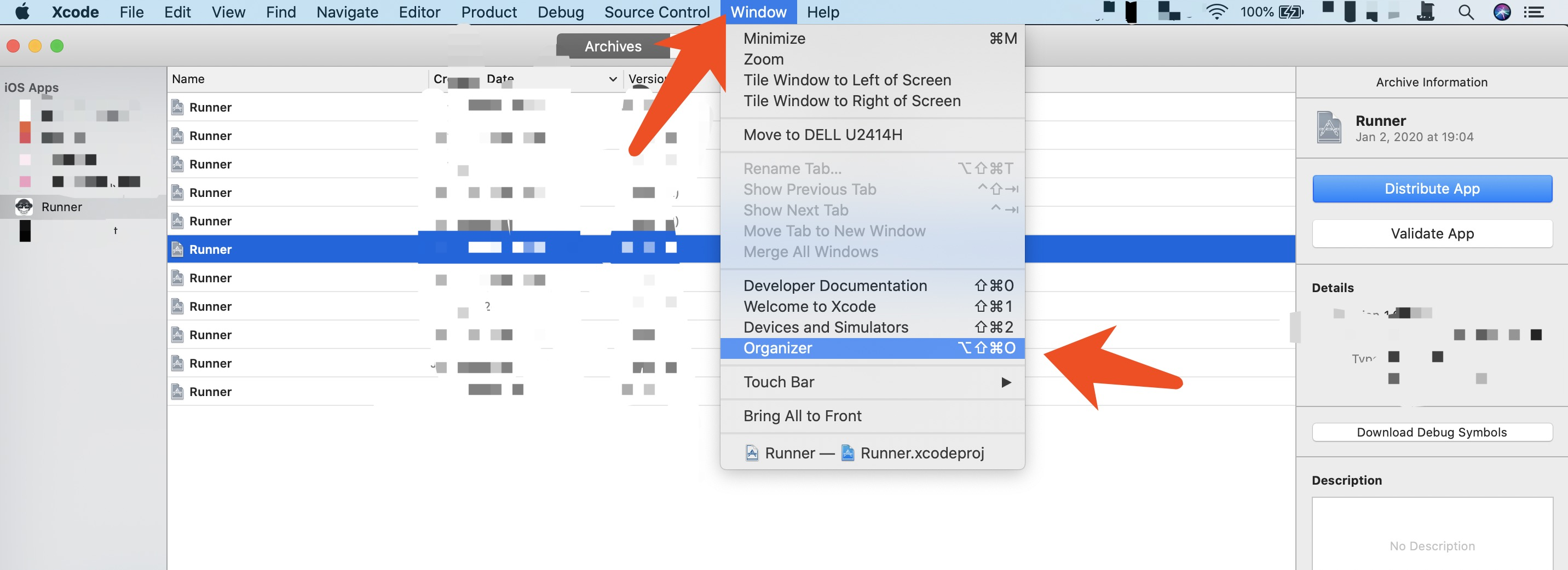 打包成功后可以看到如下界面,找到你最新打包的那一项,选择 Distribute App 就可以进入下一步;另外打包过的项目在 Window > Organizer 也可以重新找到。