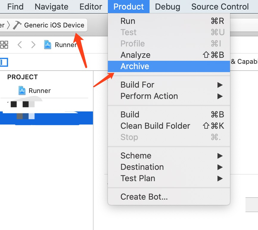 如下图所示,首先确保🔨位置不要选中模拟器,之后在 Product > Archive 就会开始导出打包。