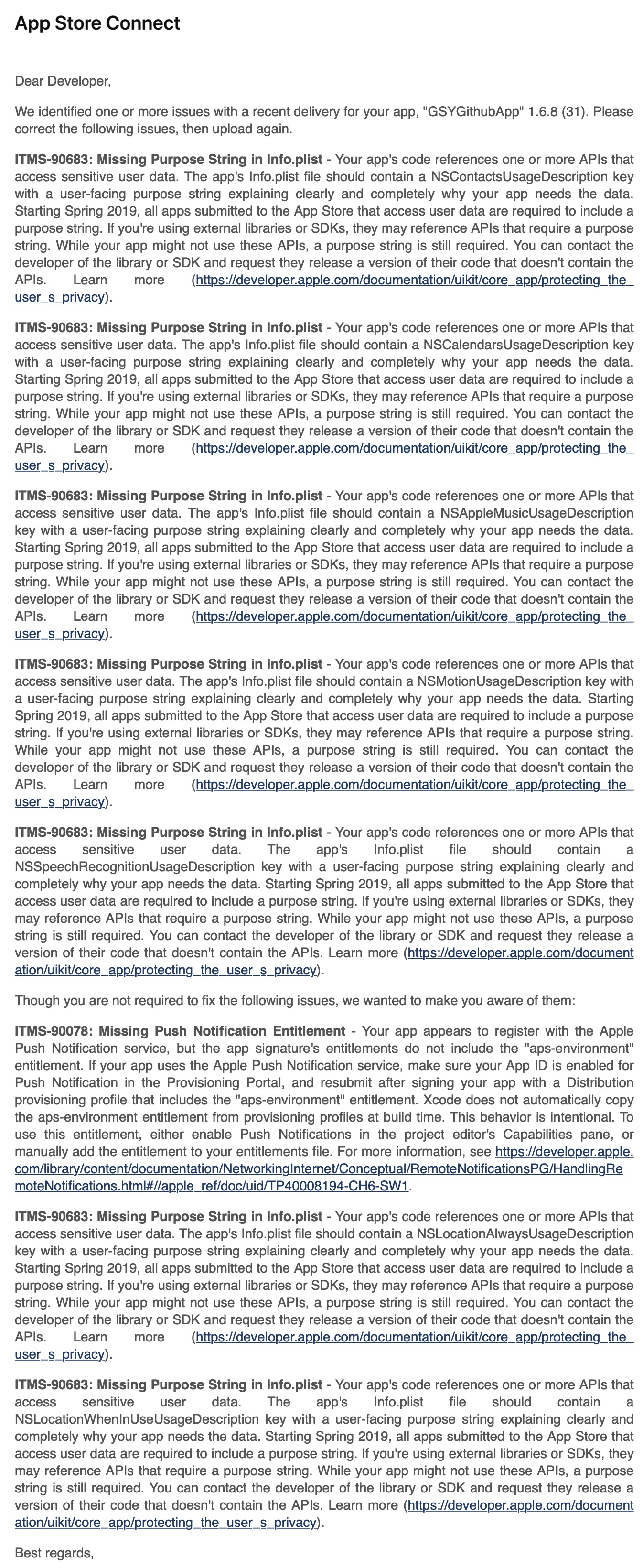 其中比如 ITMS-90683 说的是没有在 plist 内配置 NSContactsUsageDescription 的 key-value,也就是向用户解释你为什么需要用到读取用户联系人的权限。