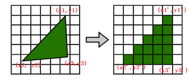 光栅化也称栅格化,是指将几何数据经过一系列变换后最终转换为像素,从而呈现在显示设备上的过程。光栅化的本质是坐标变换、几何离散化。