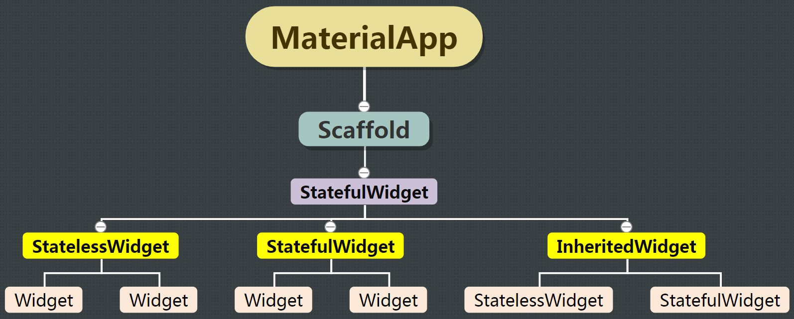 真正的渲染对象。最接近原生开发中的UI控件元素。它主要处理UI构建过程中的布局与绘制。它依赖于Element树来生成一颗RenderObject树。
