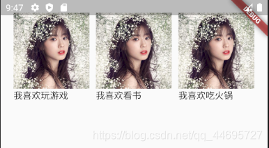 import 'package:flutter/material.dart'; void main() { runApp(MyApp()); } class MyApp extends StatelessWidget { @override Widget build(BuildContext context ){ return MaterialApp( title:'ListView widget', home:Scaffold( body: GridView.count( padding:const EdgeInsets.all(20.0), crossAxisSpacing: 10.0, crossAxisCount: 3, children: <Widget>[ Image.network( 'https://dss0.bdstatic.com/70cFvHSh_Q1YnxGkpoWK1HF6hhy/it/u=3289342822,655864970&fm=26&gp=0.jpg', width: 200, height: 200, ), Image.network( 'https://dss0.bdstatic.com/70cFvHSh_Q1YnxGkpoWK1HF6hhy/it/u=3289342822,655864970&fm=26&gp=0.jpg', width: 200, height: 200, ), Image.network( 'https://dss0.bdstatic.com/70cFvHSh_Q1YnxGkpoWK1HF6hhy/it/u=3289342822,655864970&fm=26&gp=0.jpg', width: 200, height: 200, ), const Text('我喜欢玩游戏'), const Text('我喜欢看书'), const Text('我喜欢吃火锅') ], ) ), ); } }