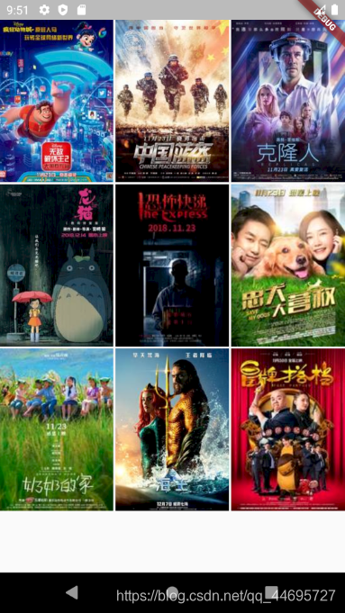 import 'package:flutter/material.dart'; void main() { runApp(MyApp()); } class MyApp extends StatelessWidget { @override Widget build(BuildContext context ){ return MaterialApp( title:'ListView widget', home:Scaffold( body:GridView( gridDelegate: SliverGridDelegateWithFixedCrossAxisCount( crossAxisCount: 3,//一行放几幅图片 mainAxisSpacing: 2.0,//行距 crossAxisSpacing: 2.0,//列距 childAspectRatio: 0.7,//图片宽高比,因为海报一般长:宽是4:3嘛所以我搞的是这样 ), children: <Widget>[ Image.network('http://img5.mtime.cn/mt/2018/10/22/104316.77318635_180X260X4.jpg',fit: BoxFit.cover), Image.network('http://img5.mtime.cn/mt/2018/10/10/112514.30587089_180X260X4.jpg',fit: BoxFit.cover), Image.network('http://img5.mtime.cn/mt/2018/11/13/093605.61422332_180X260X4.jpg',fit: BoxFit.cover), Image.network('http://img5.mtime.cn/mt/2018/11/07/092515.55805319_180X260X4.jpg',fit: BoxFit.cover), Image.network('http://img5.mtime.cn/mt/2018/11/21/090246.16772408_135X190X4.jpg',fit: BoxFit.cover), Image.network('http://img5.mtime.cn/mt/2018/11/17/162028.94879602_135X190X4.jpg',fit: BoxFit.cover), Image.network('http://img5.mtime.cn/mt/2018/11/19/165350.52237320_135X190X4.jpg',fit: BoxFit.cover), Image.network('http://img5.mtime.cn/mt/2018/11/16/115256.24365160_180X260X4.jpg',fit: BoxFit.cover), Image.network('http://img5.mtime.cn/mt/2018/11/20/141608.71613590_135X190X4.jpg',fit: BoxFit.cover), ], ) ), ); } }
